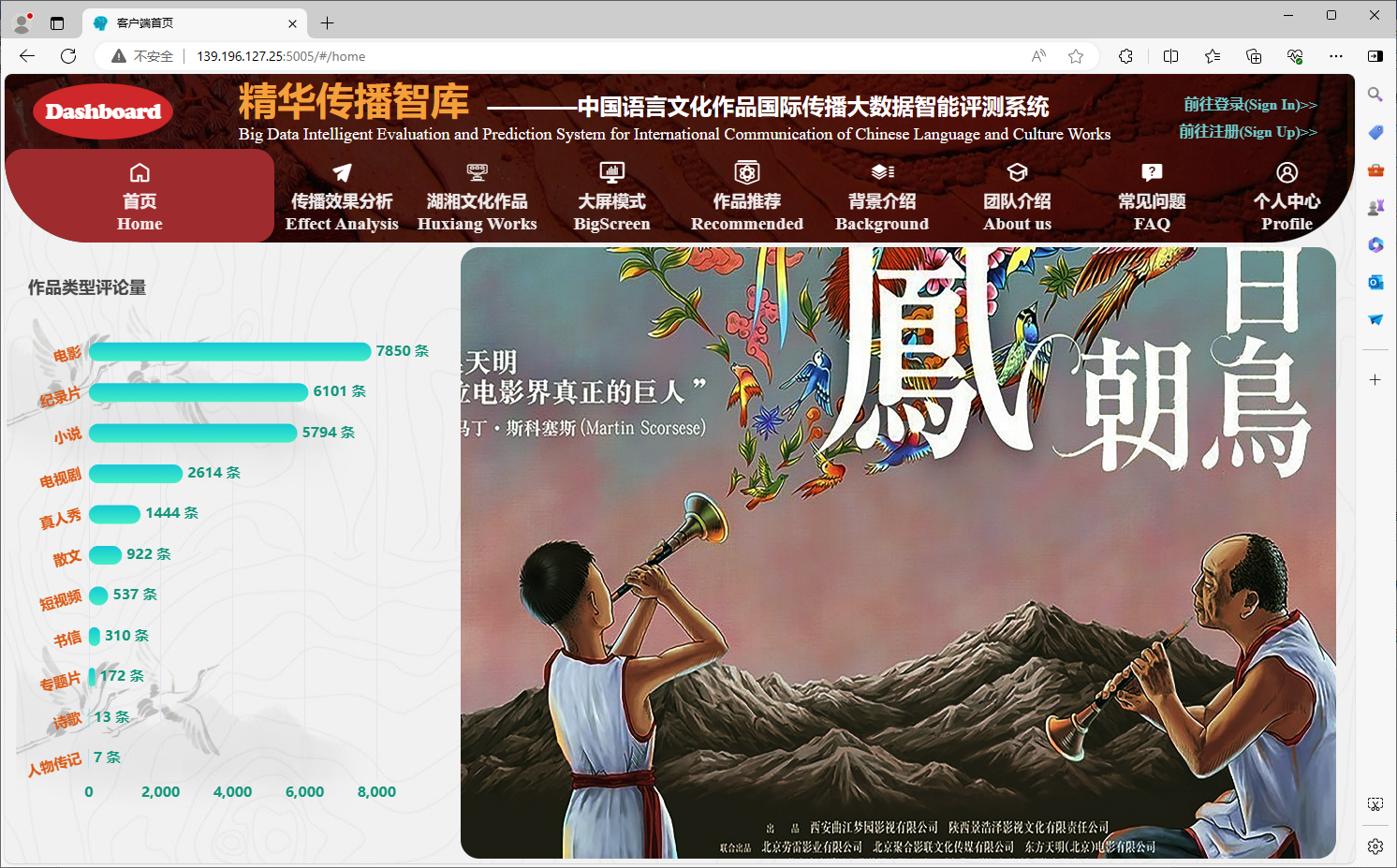 本系统由马华教授带领团队成员黄志祥、张凯芹和羊涛开发完成。该系统借助网络爬虫从不同角度和层次爬取国际知名主流媒体、社交和影视平台、读书网站的文本、图像、视频等多模态评论与社交数据,通过多模态情感分析模型、主题分析模型等对多模态评论信息进行挖掘以分析中国语言文化作品的传播效果,构建作品画像,最后使用可视化技术构建传播效果智能评测结果的展示系统。