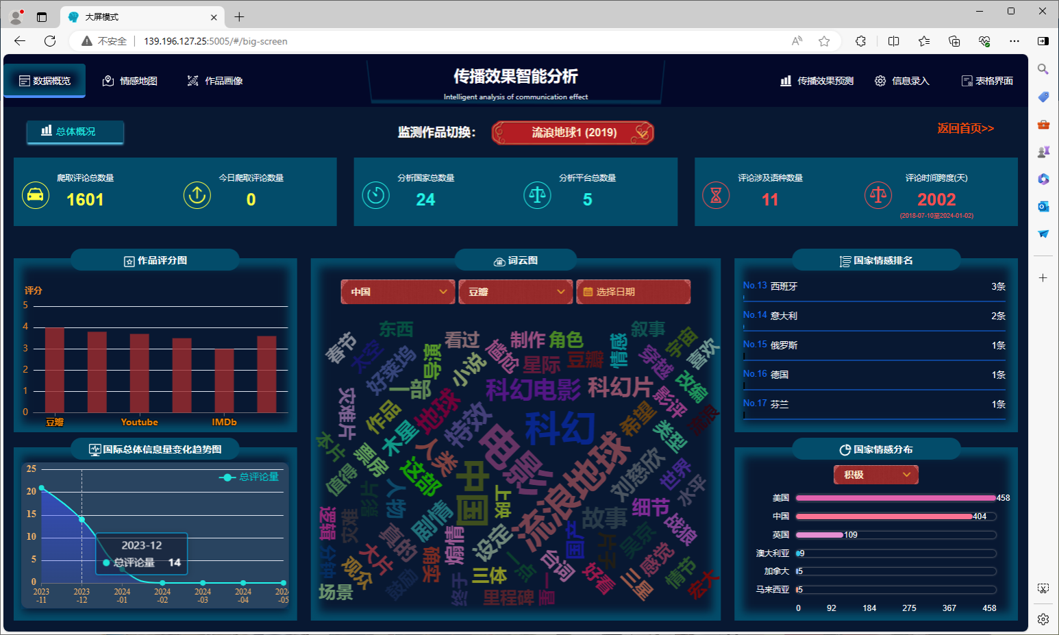 2.大屏模式:查看文化作品的国家整体情感排名、查看文化作品的评论语义网络图、查看文化作品的国际信息量变化趋势、查看文化作品的国际情感分布、查看文化作品的评分、查看文化作品的主题情感分布、查看文化作品的评论词云图、查看文化作品的国家情感数量、查看文化作品的评论数据来源分布、查看文化作品的评论数据总体概况、查看文化作品的作品画像、查看文化作品的传播效果预测。