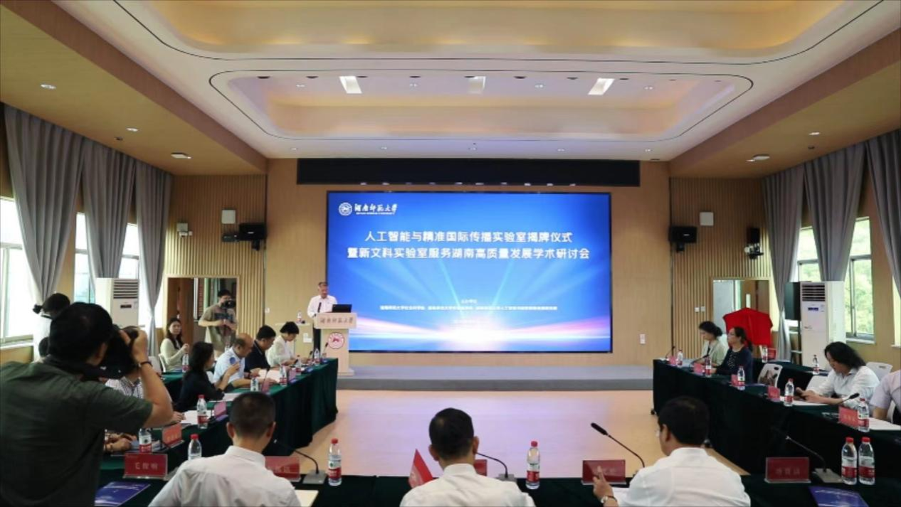 5月16日上午,我校人工智能与精准国际传播实验室揭牌仪式暨新文科实验室服务湖南省高质量发展学术研讨会在腾龙楼613学术报告厅举行。湖南省社科联党组书记、副主席(主持日常工作)胡代松,我校党委书记、欧洲科学院院士蒋洪新出席并讲话,会议由副校长唐贤清主持。