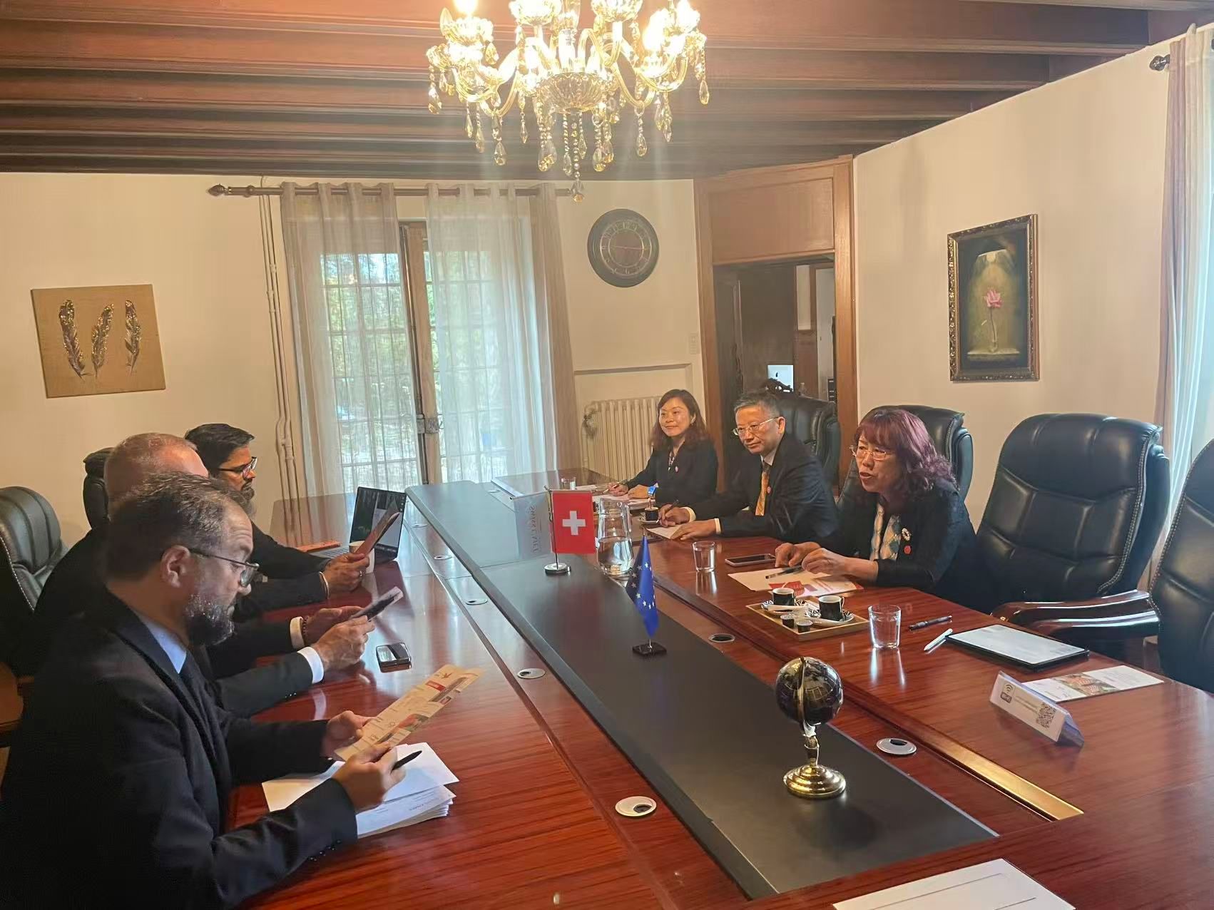 会议期间,曾艳钰率代表团专程拜访世界知识产权组织(WIPO),与语言司司长樊立君就国际组织人才联合培养、多语种语言服务、知识产权语言资源建设等议题进行务实探讨。双方一致同意进一步推动在学生实习、师资培训、合作研究等方面的实质性合作。