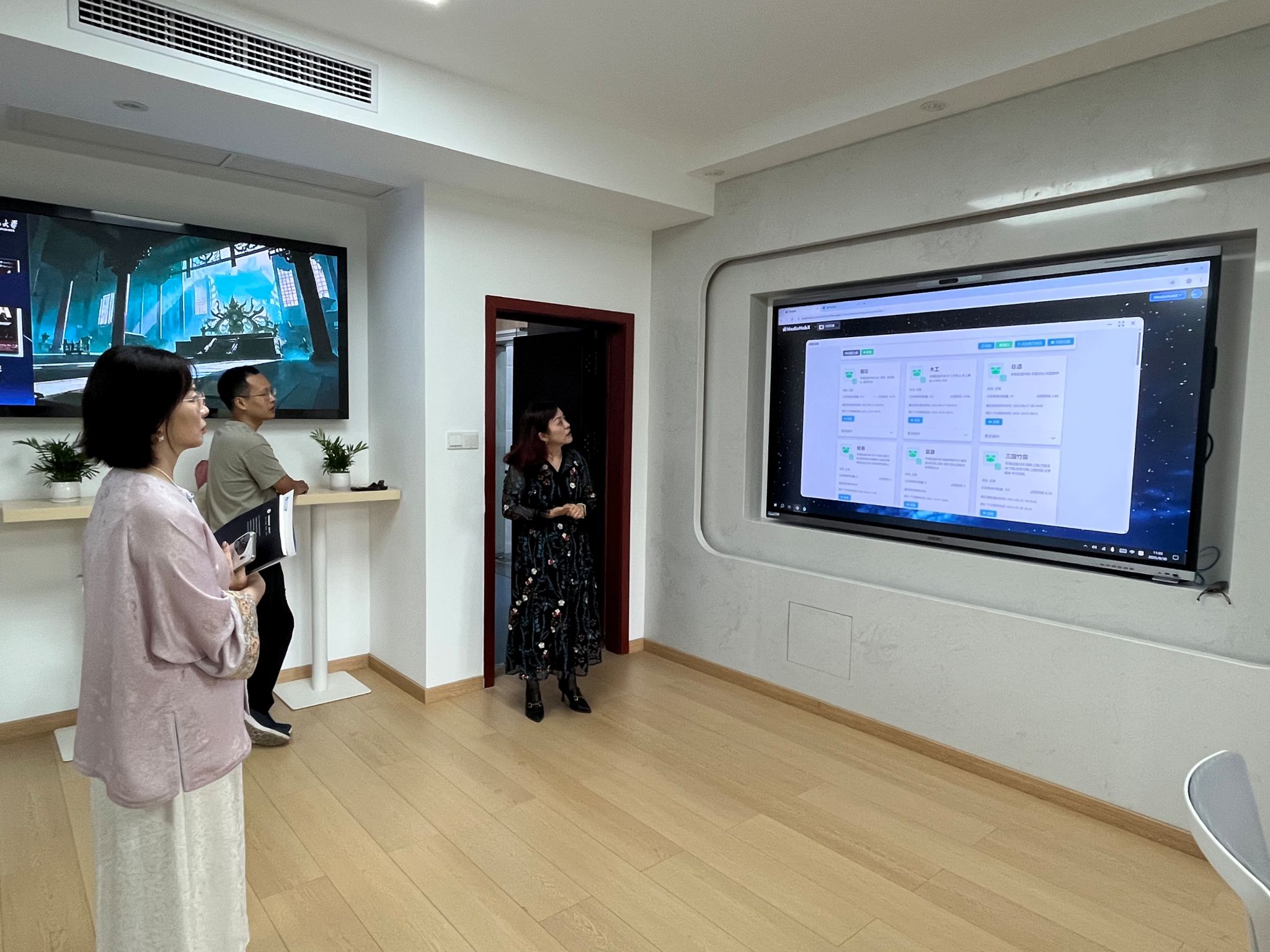 在随后进行的座谈会上,与会人员围绕AI技术如何助力博物馆文化国际传播展开深入交流。曾道建提出,可以构建内容数据库,利用AI进行智能推荐与内容生成,并通过分析用户数据持续优化传播策略。围绕应用场景拓展,王倩提出开发虚拟导览、AR互动体验、个性化内容推荐等新型文化产品的建议,并希望通过博物馆和研究院的合作,融合历史文化与现代科技,增强文化传播的吸引力与感染力。